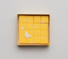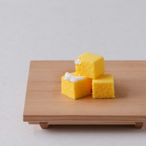 松江藩七代藩主・松平不昧公が御好みとされた「菜種の里」は、春の菜畑を蝶が飛びかう様を表現した打ち物の風味ゆかしいお茶席菓子です。三英堂相伝の銘菓「菜種の里」を食べやすく小さなサイコロ状にし、かわいらしい蝶の干菓子を添えました。