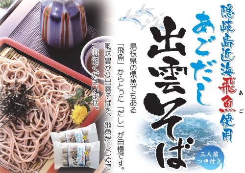 島根県隠岐島近海のあご(飛魚)からとった自慢のだしがきいたつゆ付の出雲そばです。出雲そばは、そばの実を殻ごと製粉するために色が黒っぽく、風味が強いのが特徴です。