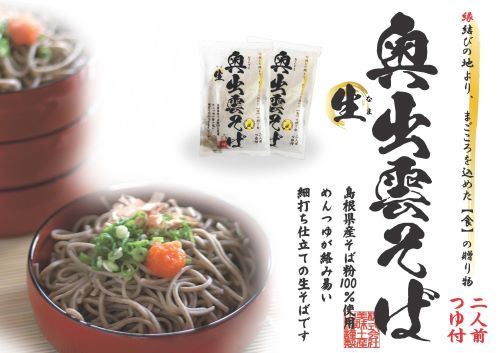 めん(そば粉(島根県産)、小麦粉、食塩、小麦たん白/酸味料)、つゆ(しょうゆ(本醸造、砂糖、果糖ぶどう糖液糖、魚介エキス、食塩、発酵調味料、昆布エキス、かつおぶし、さばぶし/調味料(アミノ酸等)、カラメル色素)、(一部にそば・小麦・大豆・さばを含む)