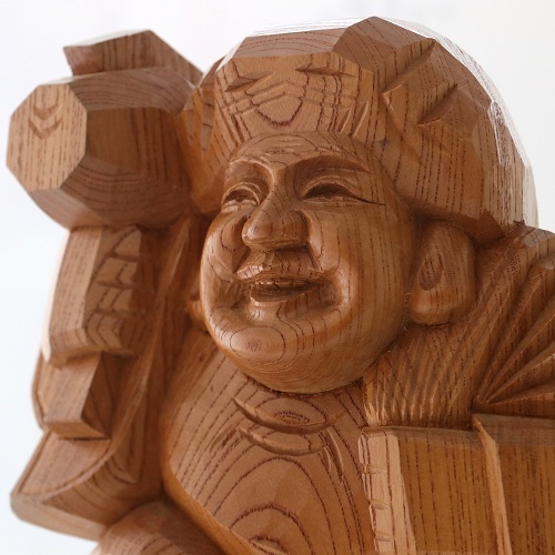 五穀豊穣、財運、金運の神様として知られる大黒様。荒々しく彫った刀痕を活かし、彩色等せず丁寧に磨いて仕上げています。