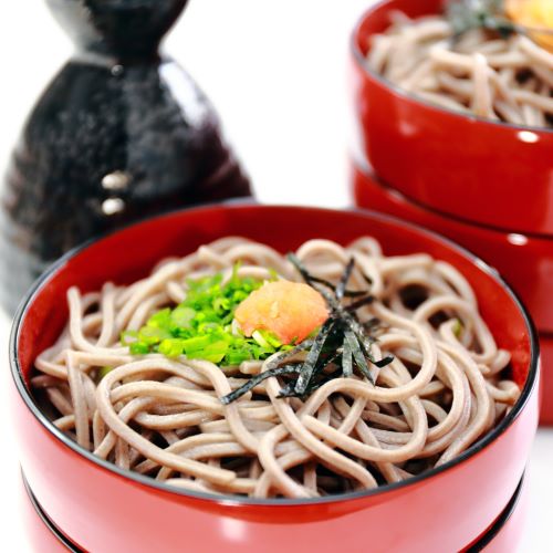 国産そば粉を使用した出雲そばの特徴である「挽きぐるみそば粉」を使用した五割そばです。風味良いそばに鰹の出汁を効かせたつゆ付です。割子そば・釜揚げそばとしてお楽しみいただけます。島根を訪れられたお客様に出雲路のお土産としていかがでしょうか。
