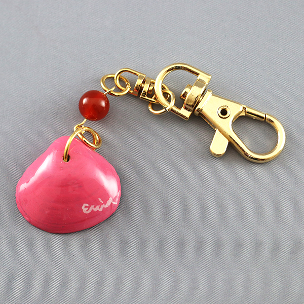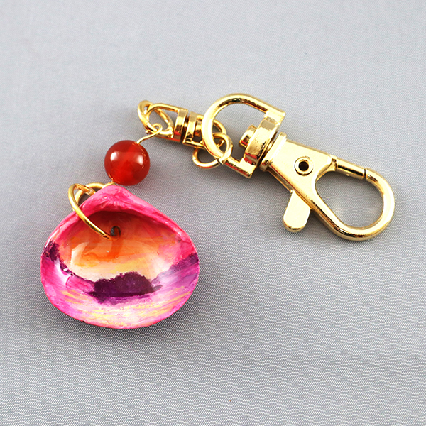 宍道湖産のしじみを丁寧に処理し、手描きで制作した後、レジンコーティングして一つずつ天然石”カーネリアン”を付け、キーホルダーに仕上げました。